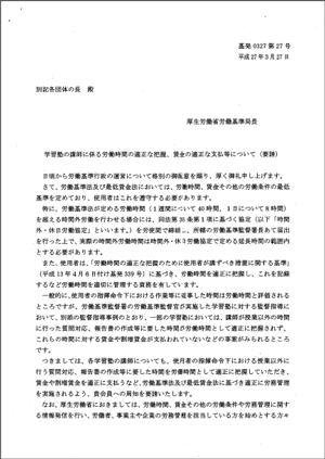 個別指導塾ユニオンでは、厚生労働省労働基準局監督課から、この改善要請の書類を入手しました。下記のリンクよりご覧いただけます。